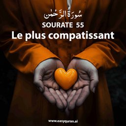 Cette sourate mecquoise est un appel aux humains et aux djinns à reconnaître les bienfaits infinis d'Allah, d'où la question récurrente : « Lequel donc des bienfaits de votre Seigneur nierez-vous tous deux ? », répétée trente et une fois. La vie sur terre prendra fin, annonçant le Jour du Jugement, où les gens seront classés en trois groupes selon leurs œuvres et les rétributions qui en découleront : les mécréants (versets 31-45), les meilleurs des croyants (versets 46-61) et les croyants ordinaires (versets 62-78). Au Nom d'Allah, le Tout Miséricordieux, le Très Miséricordieux.