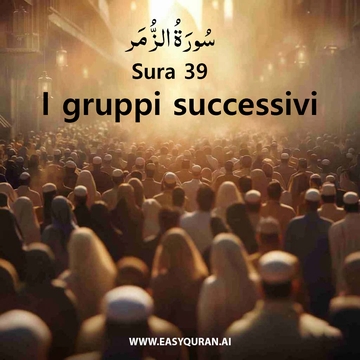 4. Se Allah avesse voluto avere prole, avrebbe scelto ciò che voleva dalla Sua creazione. Gloria a Lui! Egli è Allah—l'Unico, il Supremo. 5. Ha creato i cieli e la terra con un fine. Avvolge la notte intorno al giorno e avvolge il giorno intorno alla notte. E ha assoggettato il sole e la luna, ciascuno in orbita per un termine stabilito. Egli è veramente l'Onnipotente, il Perdonatore. 6. Vi ha creati da un'unica anima, poi da essa ha creato la sua compagna. E ha prodotto per voi quattro paia di bestiame. Vi crea nei ventri delle vostre madri, una creazione dopo l'altra, in tre strati di tenebre. Quello è Allah—il vostro Signore! A Lui appartiene la sovranità. Non c'è dio all'infuori di Lui. Come potete dunque essere sviati?