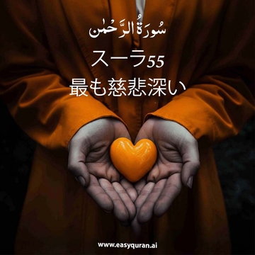 このマッカ啓示のスーラは、人間とジンに対し、アッラーの無限の恩恵を認めるよう呼びかけるものです。それゆえ、「では、あなた方両者(人間とジン)は、あなた方の主のどの恩恵を否定するのか?」という問いかけが31回繰り返されます。地上での生は終わりを告げ、審判の日が訪れます。そこでは人々が、彼らの行いとそれに応じた報奨に基づいて三つのグループに分類されます。すなわち、不信仰者たち(31-45節)、最善の信仰者たち(46-61節)、そして平均的な信仰者たち(62-78節)です。 慈悲あまねく慈愛深きアッラーの御名において