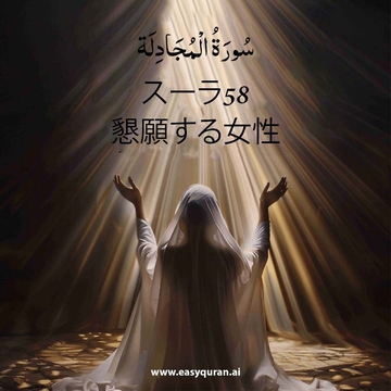 1. アッラーは、夫のことであなた(預言者よ)に訴え、アッラーに懇願した女の言い分を確かに聞いた。アッラーはあなたたちのやり取りを聞いた。本当にアッラーは全てを聞き、全てを見通される御方である。