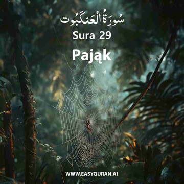 Ta mekkańska sura bierze swoją nazwę od przypowieści o pająku z wersetu 41. Początek sury podkreśla rolę prób i doświadczeń w ujawnianiu tych, którzy są prawdziwie niezłomni, i tych, którzy nimi nie są. Noe, Abraham, Lot i Szu’ajb wyróżniają się swoją wytrwałością. Wspomina się o różnych ludach i o różnych sposobach, w jakie zostali zniszczeni za ich odrzucenie prawdy (werset 40). Argumenty pogan przeciwko Prorokowi i Koranowi zostają gruntownie obalone. Sura kończy się, chwaląc tych, którzy pokładają ufność w Allahu i dążą do Jego sprawy. To zakończenie toruje drogę dla otwarcia następnej sury. W Imię Allaha — Najłaskawszego, Najmiłosierniejszego