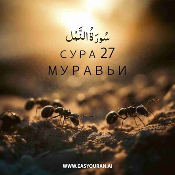 Эта мекканская сура повествует о встречах Сулеймана (ﷺ) с муравьями (отсюда и название суры), удодом и царицей Савской — которые не упоминаются ни в одной другой суре. Могущество Аллаха творить и даровать удел противопоставляется бессилию идолов. Язычникам приводятся устрашающие примеры, наряду с предупреждением об ужасах Судного дня. Пророк (ﷺ) заверяется в истинности Корана, и ему сообщается, что его обязанность — лишь передать послание. Суд принадлежит одному лишь Аллаху. Во имя Аллаха, Милостивого, Милосердного.